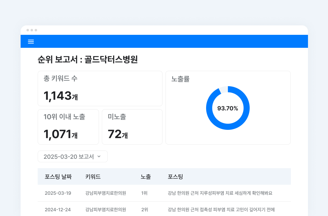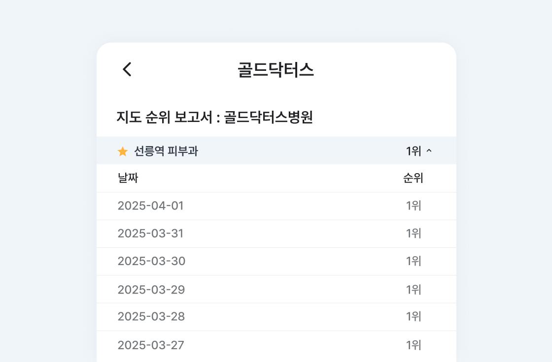 골드닥터스는 자체 개발한 순위 체크 시스템을 통해 네이버 플레이스 순위를 매일 자동으로 확인하고 기록하여 병원의 정확한 온라인 경쟁력을 체계적으로 관리합니다.