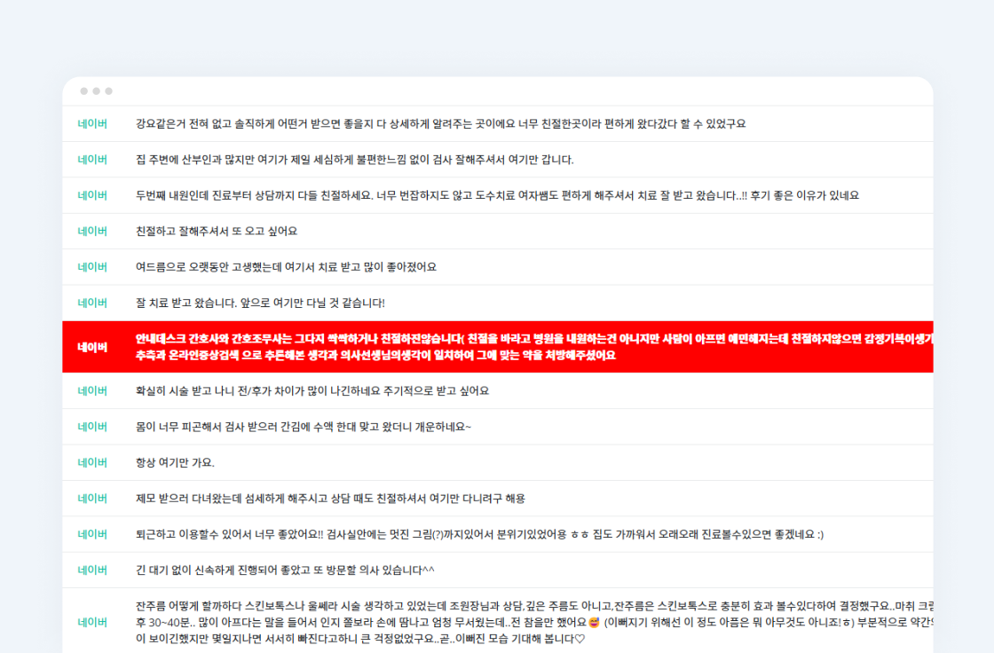 골드닥터스는 병원의 리뷰를 실시간으로 분석하고 안티 리뷰를 즉각적으로 탐지·분류하여 빠르게 대응하는 체계적이고 효율적인 안티 리뷰 케어 시스템을 운영하고 있습니다.