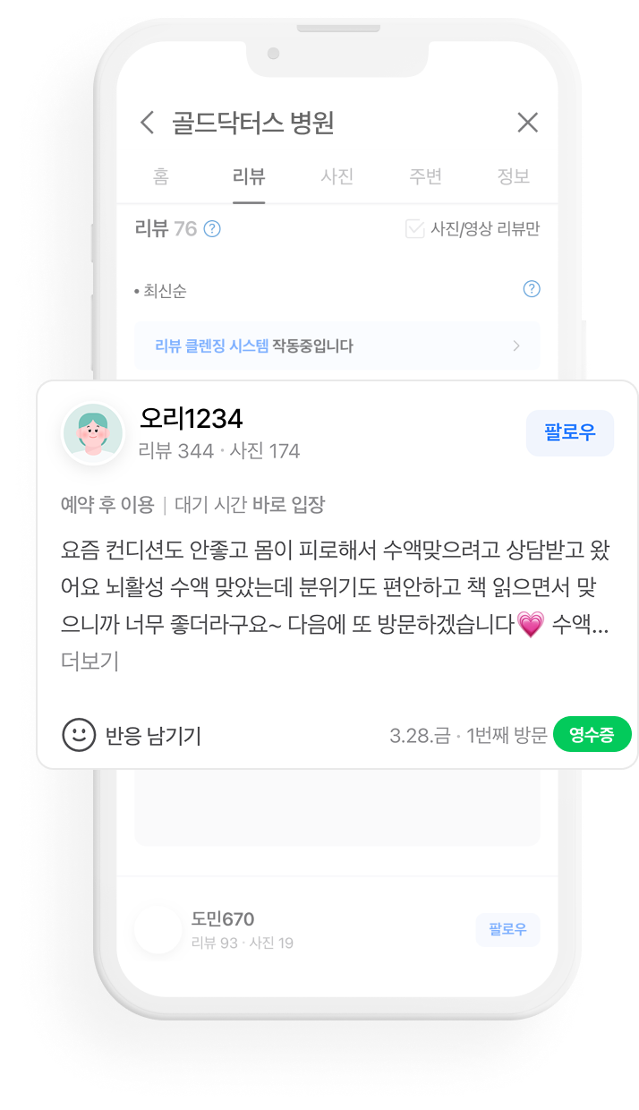 병원 선택 시 76% 온라인 리뷰를 중요하게 참고합니다.